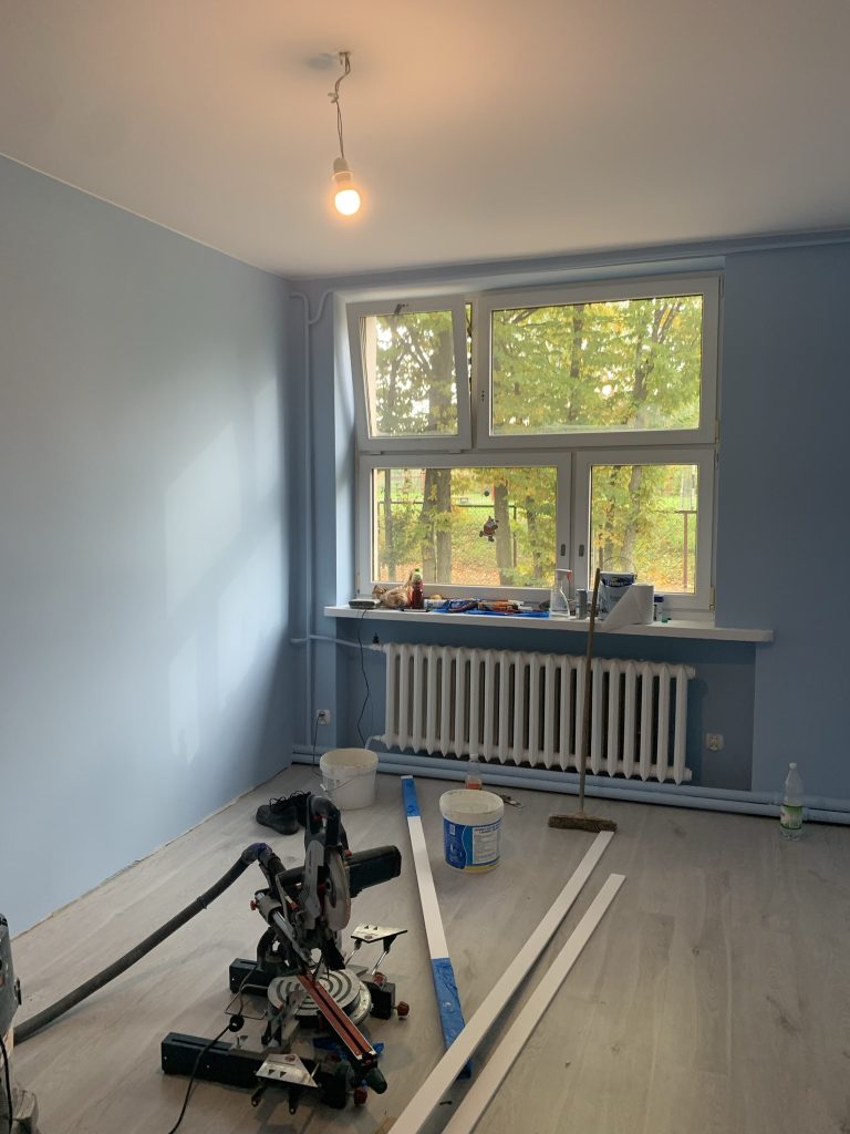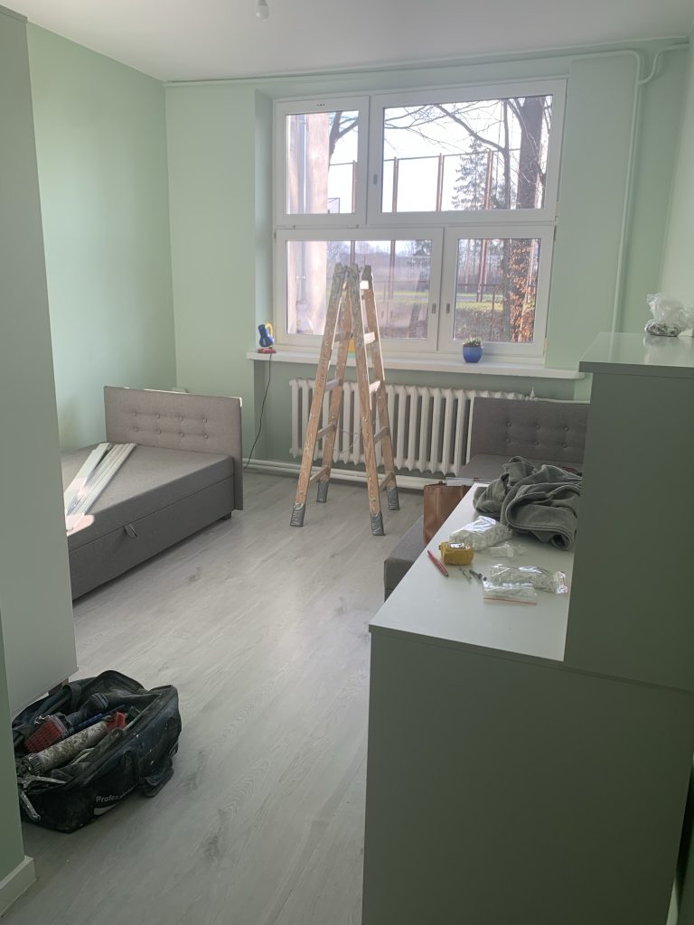 W Domu Dziecka w Olsztynie odświeżyliśmy dwa pokoje, które wymagały gruntownego remontu. W pomieszczeniach było widać wyraźne ślady użytkowania: ściany były obdrapane, lamperia zniszczona, dywany i zasłony nadawały się do wymiany, a oświetlenie nie dawało ciepła ani komfortu. Meble także nosiły oznaki intensywnej eksploatacji i nie tworzyły spójnej, funkcjonalnej całości.